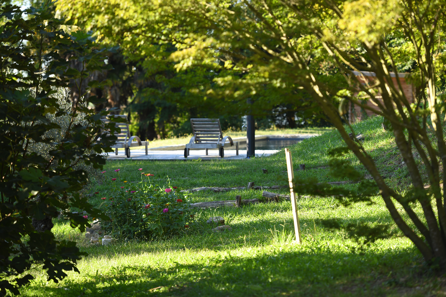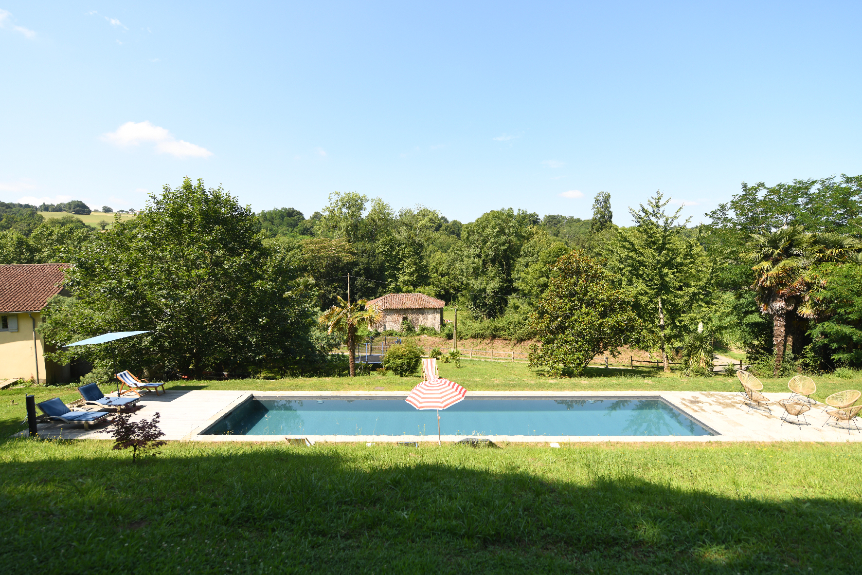 En extérieur venez profiter d’une grande piscine filtrage au sel de 15×4 mètres, d’un trampoline, d’une grande terrasse dînatoire (pour 16 personnes), de la terrasse côté piscine avec transats, salon d’été, wc extérieur. Le tout dans un parc privatif de 8000m2 et un accès privé à la rivière.